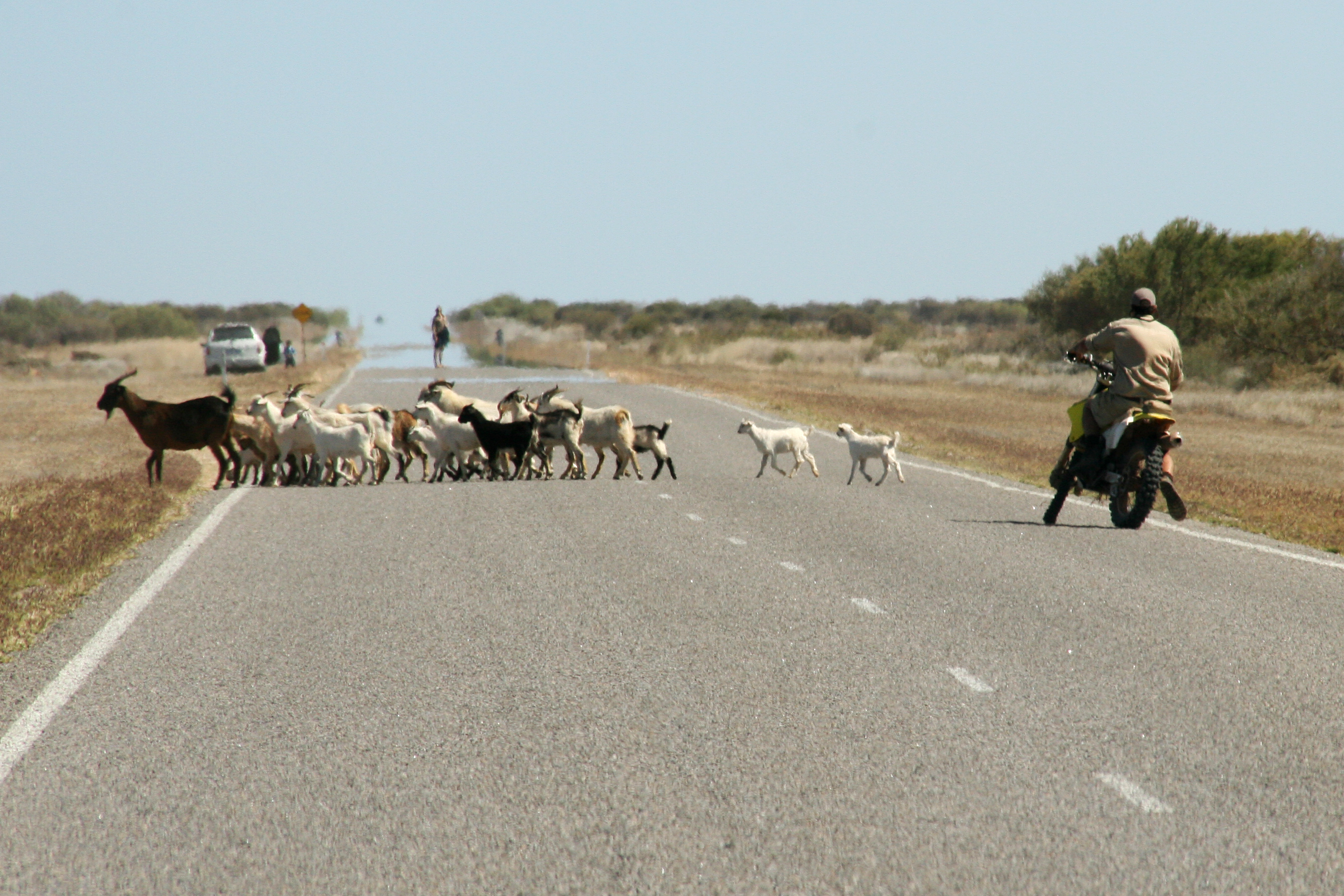 Auf dem Weg nach Carnarvon musste ich stoppen, weil Ziegen von Männern auf Motorrädern über den Highway gejagt wurden. Unser “Geisen-Peter” hätte wohl die Welt nicht mehr verstanden.